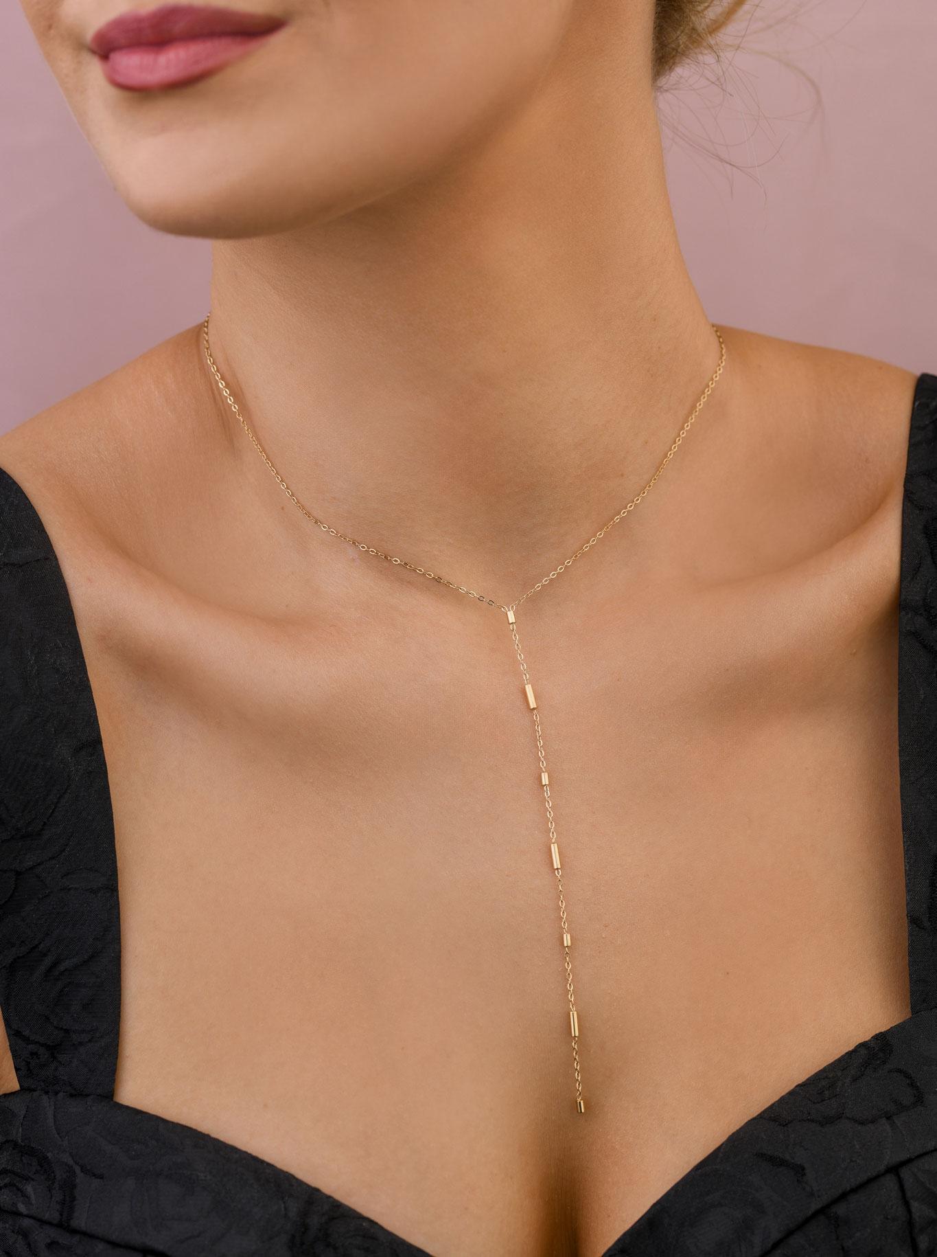 Naszyjnik krawatka, wykonany ze stali chirurgicznej / szlachetnej. Pozłacany 14-karatowym złotem nanoszonym metodą PVD- obecnie najtrwalszym sposobem powlekania. Długość naszyjnika ok. 40,5 cm z możliwością regulacji ok. 5,5 cm. Długość elementu ozdobnego ok. 12 cm. Typ zapięcia: k...